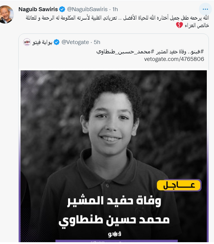وقال “ساويرس”، عبر حسابه الرسمي بـ"تويتر": "الله يرحمه طفل جميل اختاره الله للحياة الأفضل.. تعزياتي القلبية لأسرته المكلومة له الرحمة وللعائلة خالص العزاء".