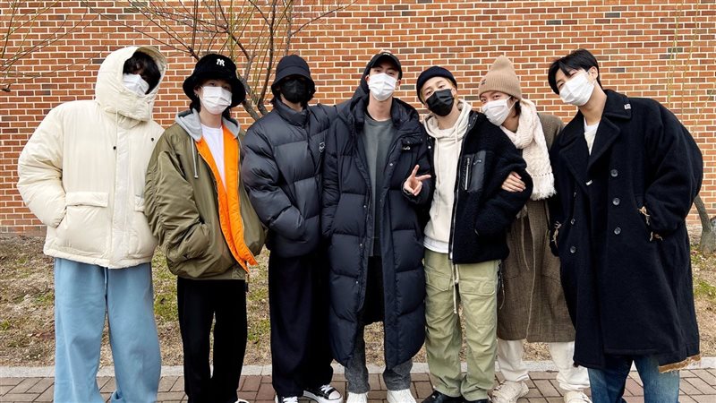 وظهر أعضاء فريق "بي تي إس BTS" الكوري، في صور حديثه لهم، وهم ملتفين حول زميلهم جين يمزحون معه ويلتقطون صور جماعية قبل مغادرته.