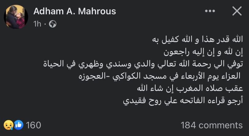 وكتب أدهم محروس، منشورًا عبر حسابه الشخصي بموقع فيسبوك، جاء فيه: الله قدر هذا والله كفيل به، إنا لله وإنا إليه راجعون، توفى إلى رحمة الله تعالى والدي وسندي وظهري في الحياة.