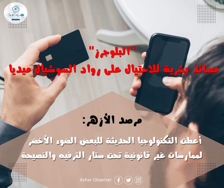 أصدر مرصد الأزهر لمكافحة التطرف بيانا قال فيه: تطل علينا مواقع التواصل الاجتماعي "السوشيال ميديا" بالكثير من المسميات التي أعطت البعض الضوء الأخضر لتنفيذ ممارسات غير قانونية تحت ستار الترفيه والنصيحة، فما بين نصائح بالاستثمار في مشاريع معينة إلى الترويج لمنتجات مجهولة المصدر باتت تضج العديد من الصفحات بفيديوهات لما يطلق عليهم "البلوجرز" أو المدونين - وهم مجموعة من الأشخاص العاديين الذين اتخذوا من صفحاتهم منصة للانطلاق إلى الجمهور العام ممن يرتادون مواقع التواصل الاجتماعي لتقديم محتويات متنوعة شملت الترويج للمنتجات والأنشطة الاستثمارية وتقديم النصائح في شتى المجالات على الرغم أن الكثير منهم لا يملكون من المعرفة الأكاديمية ما يؤهلهم لهذا الدور-، وهو ما جعل من تلك المواقع مصيدة حقيقية لرواد السوشيال ميديا.