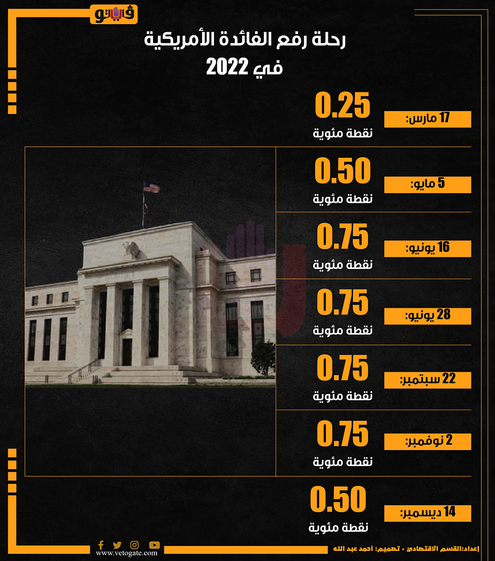 رحلة رفع الفائدة الأمريكية في 2022 |إنفوجراف الأربعاء 14/ديسمبر/2022 - 09:54 م 12/14/2022 9:54:16 PM الاحتياطي الفيدرالي الأمريكي قسم الاقتصاد شارك طباعة 18 حجم الخط شارك طباعة سعر الفائدة الأمريكية الفائدة الأمريكية الاقتصاد الأمريكى