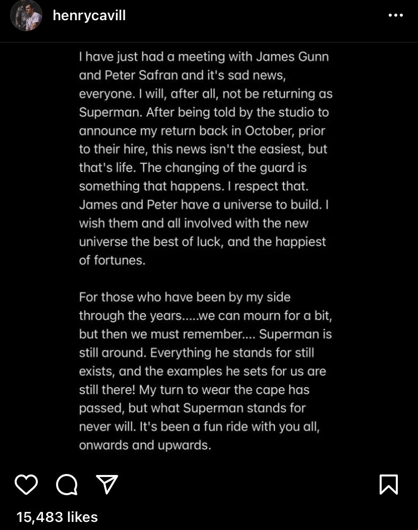 وأكد الممثل هنري كافيل، خبر طرده من الشخصية عبر حسابه الرسمي علي موقع الصور والفيديوهات “انستجرام” عبر منشور، قال فيه لمعجبيه أنه لن يعود لتجسيد شخصية سوبرمان، وأنه عقد اجتماع مطول مع استديوهات دي سي لبحث إمكانيه التعاون معهم في المستقبل بعيد عن شخصية سوبر مان.