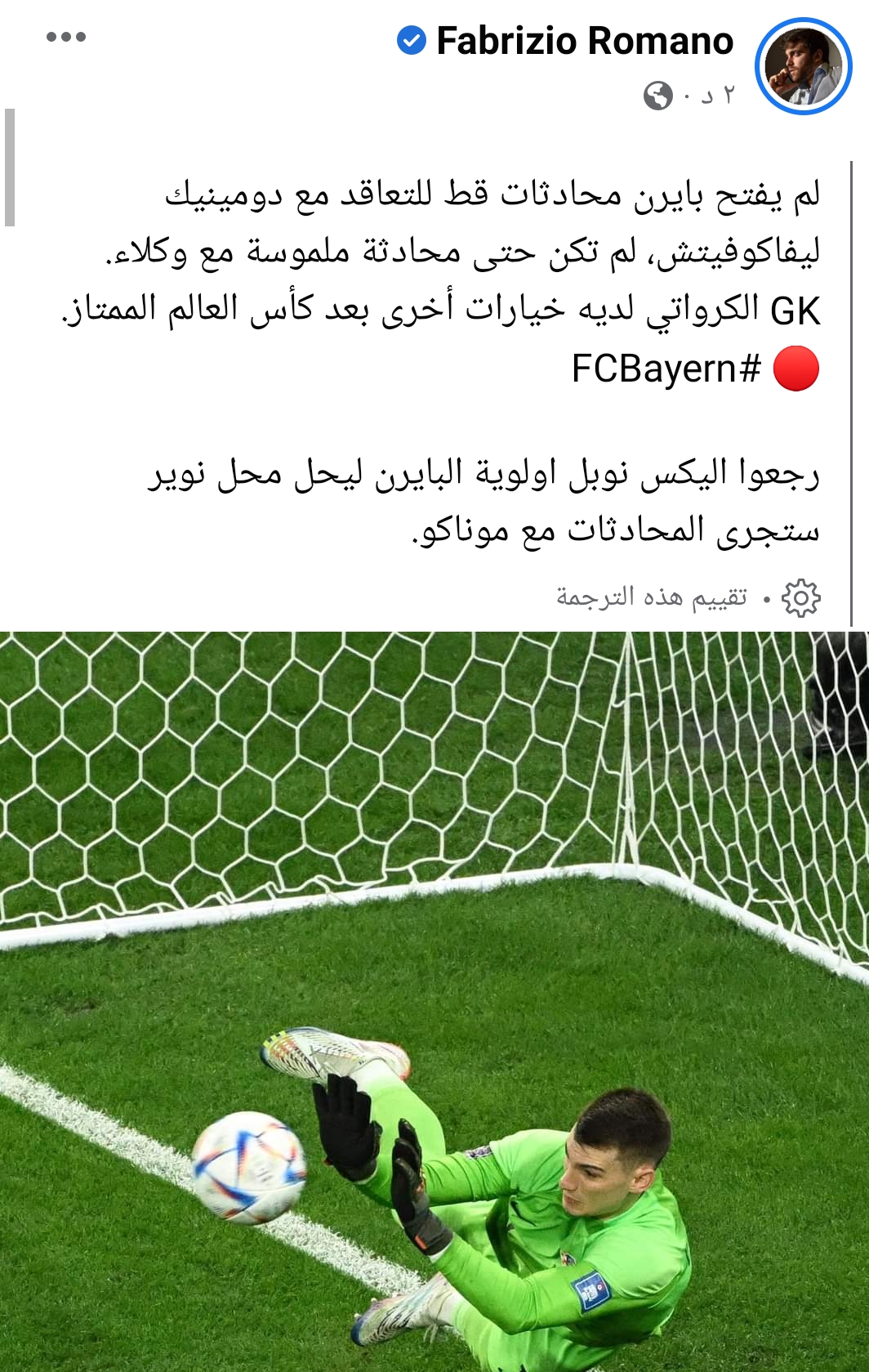 بايرن ميونيخ، كشف الصحفي فابريزيو رومانو عن انسحاب نادى بايرن ميونيخ الألماني من فكرة ضم ليفاكوفيتش حارس منتخب كرواتيا،والذي تألق وبشدة في مونديال قطر 2022.