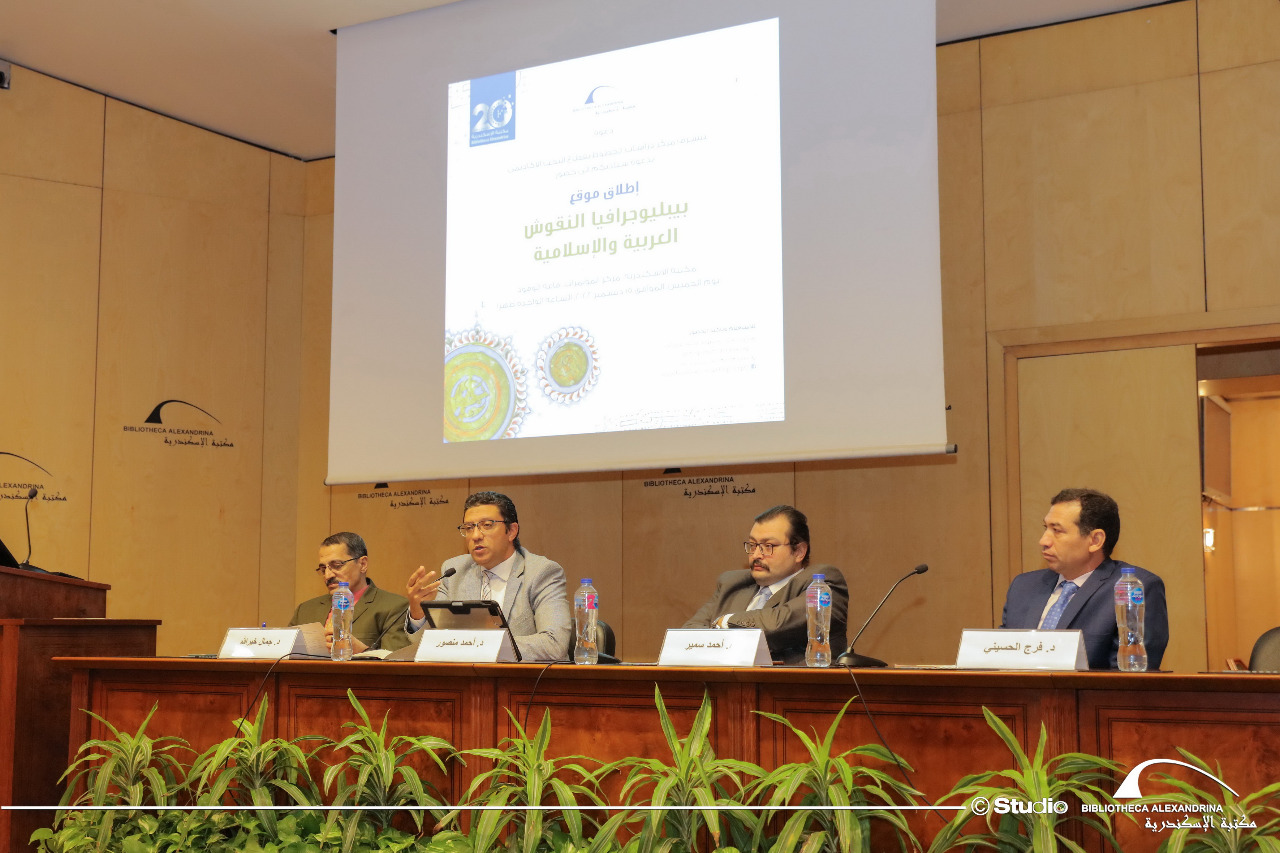 وفي الافتتاحية تحدث الدكتور أحمد منصور، مدير مركز دراسات الخطوط بمكتبة الإسكندرية عن بداية الاهتمام بالنقوش العربية منذ القرنين التاسع عشر والعشرين مع حركة المستشرقين، حيث زاد من وقتها الإنتاج العلمي والدراسات المتخصصة، وهو ما استدعى أن تقوم المكتبة بعمل ببليوجرافيا، وفضلت أن يكون رقميًا خاصة في ظل توافر أحدث الوسائل ولتسهيل الخدمة على الباحثين.