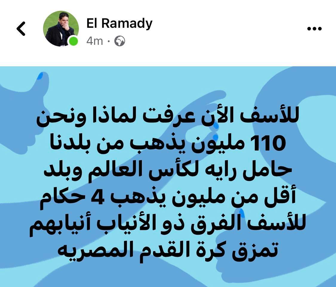 ونشر أيمن الرمادي المدير الفني لنادي أسوان عبر صفحته الشخصية علي موقع التواصل الاجتماعي فيس بوك اعتراضه على إدارة الطاقم التحكيمي لمباراة فريقه امام سيراميكا وقال:“ للأسف الأن عرفت لماذا ونحن 110 مليون يذهب من بلدنا حامل راية لكأس العالم وبلد أقل من مليون يذهب 4 حكام للأسف الفرق ذو الأنياب أنيابهم تمزق كرة القدم المصريه ”