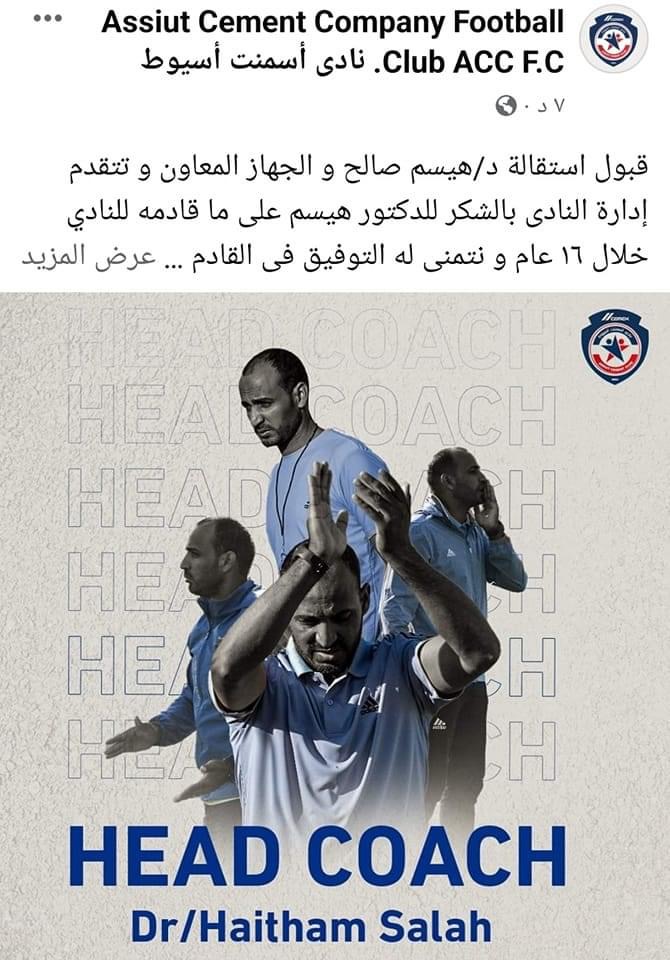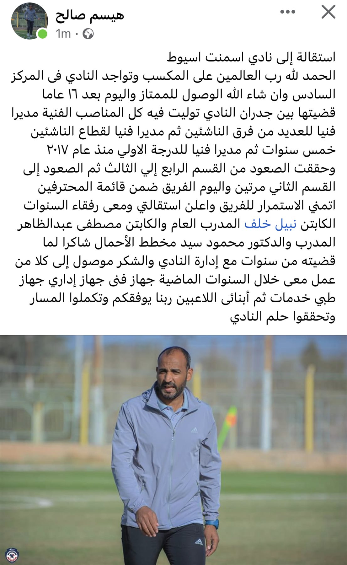 أسمنت أسيوط، أعلن مجلس ادارة نادي أسمنت أسيوط الذي يشارك ضمن مجموعة الصعيد في دوري القسم الثاني قبول استقالة هيسم صالح المدير الفني للفريق الأول لكرة القدم