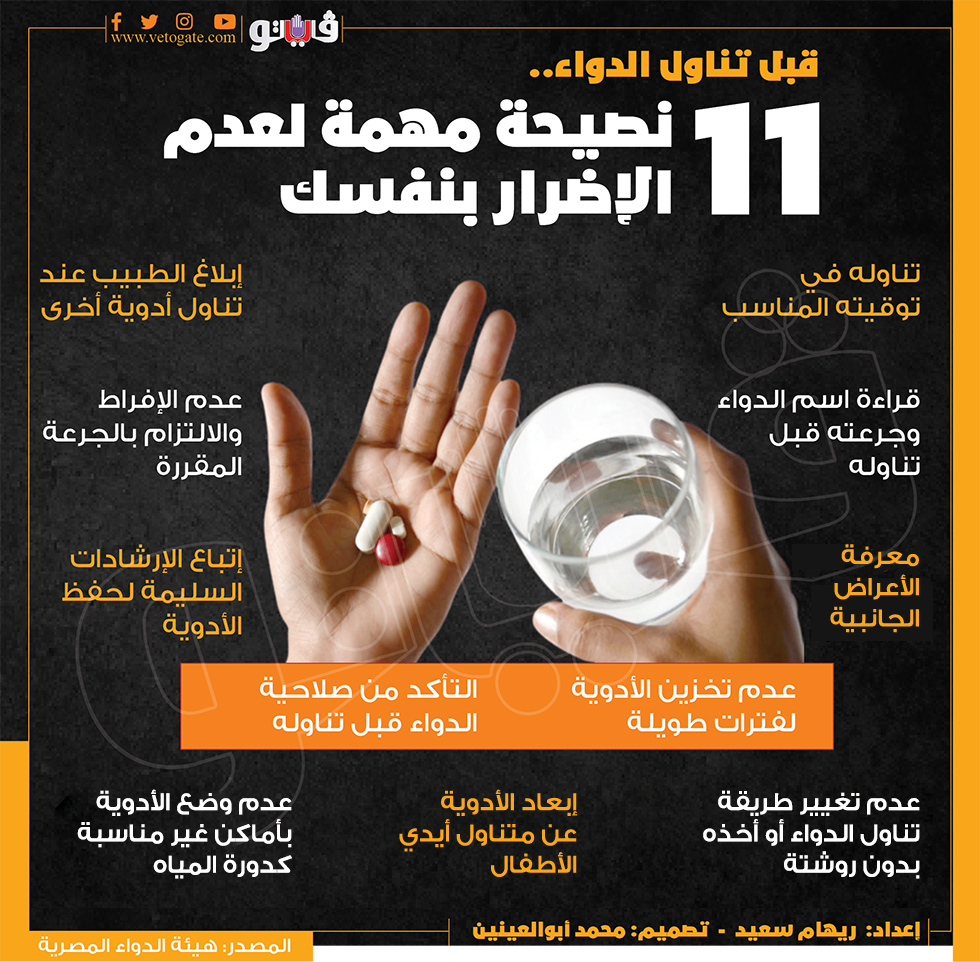 قبل تناول الدواء.. 11 نصيحة مهمة لعدم الإضرار بنفسك (انفوجراف) الجمعة 16/ديسمبر/2022 - 03:50 م 12/16/2022 3:50:32 PM نصائح لتناول الأدوية ريهام سعيد شارك طباعة 18 حجم الخط شارك طباعة الدواء المصرية هيئة الدواء المصرية تخزين الادوية