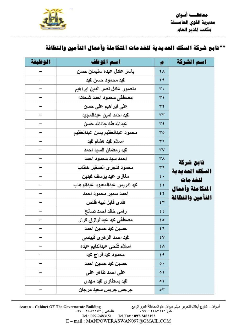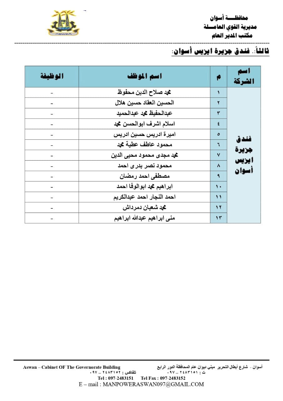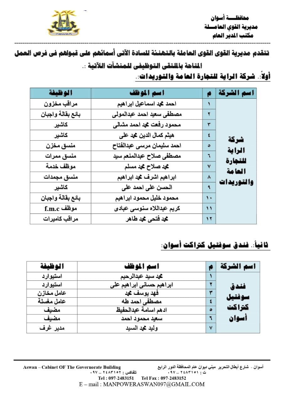 ونشرت مديرية القوي العاملة أسماء الذي تم قبولهم وهم 26 شابًا بشركة السكك الحديدية للخدمات المتكاملة وأعمال التأمين والنظامة، و13 بفندق جزيرة إيزيس أسوان، و12 بشركة الرأية للتجارة العامة والتوريدات، و7 بفندق سوفتيل كتراكت اسوان.