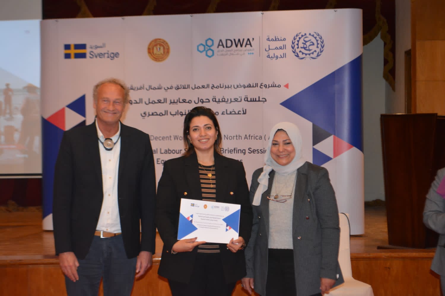 وأضاف البيان ان المشروع نجح في تنظيم جلستين تعريفيتين حول معايير العمل الدولية للسادة أعضاء مجلس النواب المصري،وقد حضر هاتين الجلستين 30 نائبًا بالإضافة إلى ممثلين عن وزارة القوى العاملة ووزارة الشؤون البرلمانية لمناقشة القضايا المتعلقة بتطبيق معايير العمل الدولية في مجالات المساواة بين الجنسين والأشخاص ذوي الإعاقة.