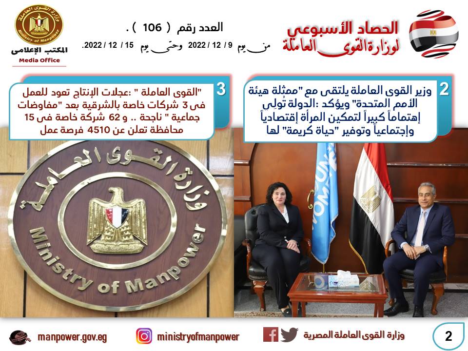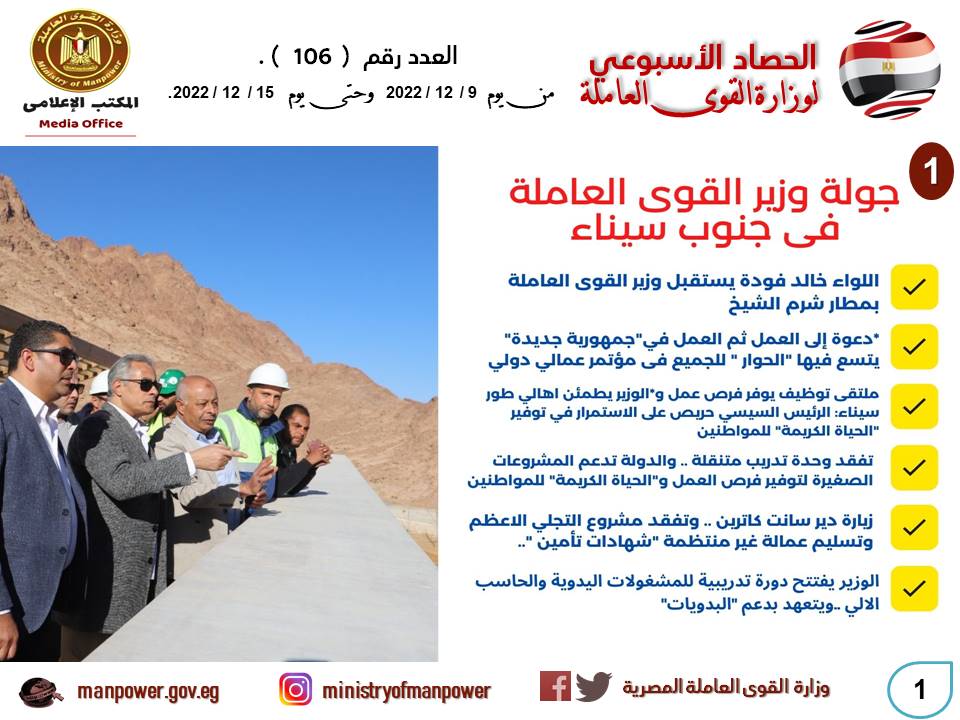 نشاط الوزارة لم يتوقف عن البحث عن فرص عمل للشباب،وحماية ودعم العمالة غير المنتظمة،وقيادة مفاوضات جماعية ناجحة تسببت في دورات عجلات الإنتاج التي تحتاجها الجمهورية الجديدة،والاستمرار في تنفيذ خطة التدريب المهني 2022-2023،من خلال عربات التدريب الثابتة والمتنقلة المنتشرة في جميع المحافظات،لتدريب الشباب على مهن يحتاجها سوق العمل،ناهيك عن النشاط الملحوظ لمكاتب التمثيل العمالي في الخارج ونجاحها على ارض الواقع في توعية عمالنا بحقوقهم وواجباتهم،وعودة مستحقات مشروعة لهم إلى أرض الوطن.