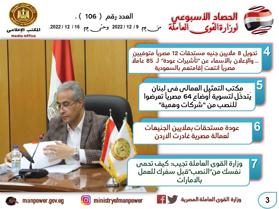 وعلى مستوى الخارج تواصل الوزارة القيام بدورها من خلال مكاتبها العمالية بالخارج،والتي نجحت في عودة مستحقات وحقوق مشروعة،فعلى سبيل المثال لا الحصر،تم تحويل 8 ملايين جنيه مستحقات 12 مصريًا توفوا بالسعودية.