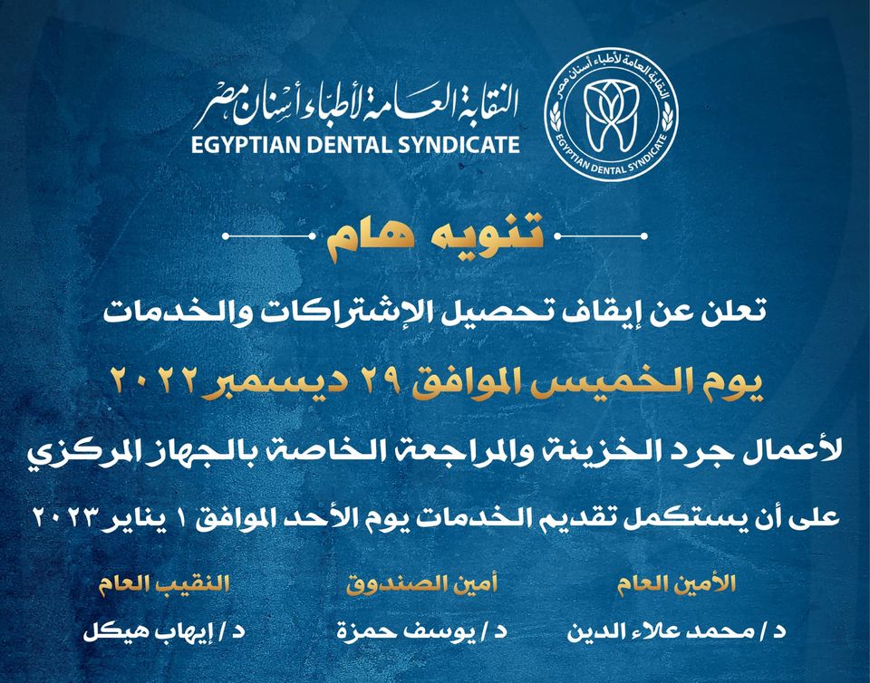 أعلنت نقابة الأسنان، برئاسة الدكتور إيهاب هيكل النقيب العام، إيقاف تحصيل الاشتراكات والخدمات الخاصة بالأعضاء وذلك يوم الخميس 29 دیسمبر 2022؛ لأعمال جرد الخزينة والمراجعة الخاصة بالجهاز المركزي على أن يستكمل تقديم الخدمات يوم الأحد الموافق 1 يناير 2023.