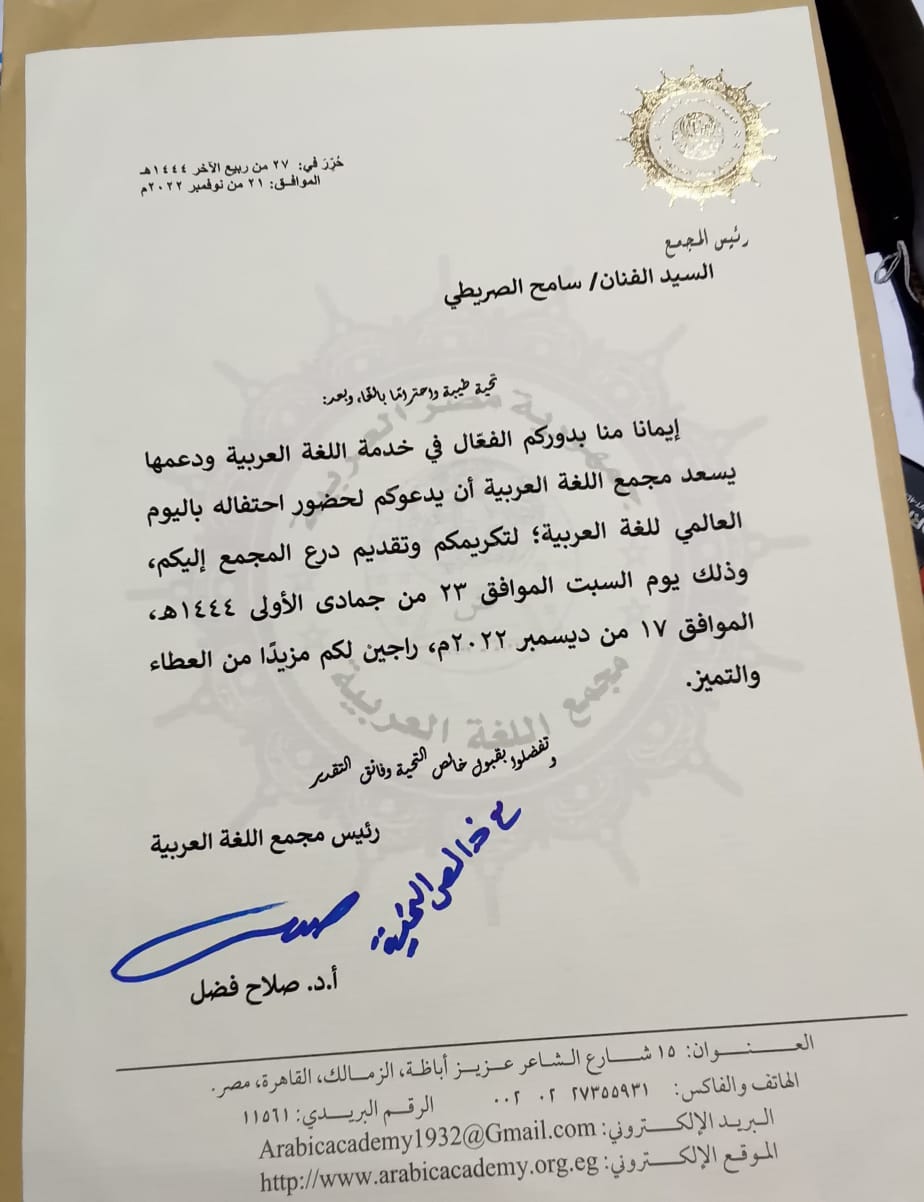 كما تقرر توجيه تكريم وإحتفاء خاص لـ الفنان الكبير سامح الصريطي من مجمع اللغة العربية.. والسبب وراء هذا التكريم بحسب ما أعلن مجمع اللغة العربية أن إيمانًا من المجمع بالدور الفعال والهام الذي يقوم به الصريطي في خدمة اللغة العربية ودعمها.. ووجه مجمع اللغة العربية دعوة للفنان لحضور تلك الاحتفالية لتكريمكم وتقديم درع المجمع.