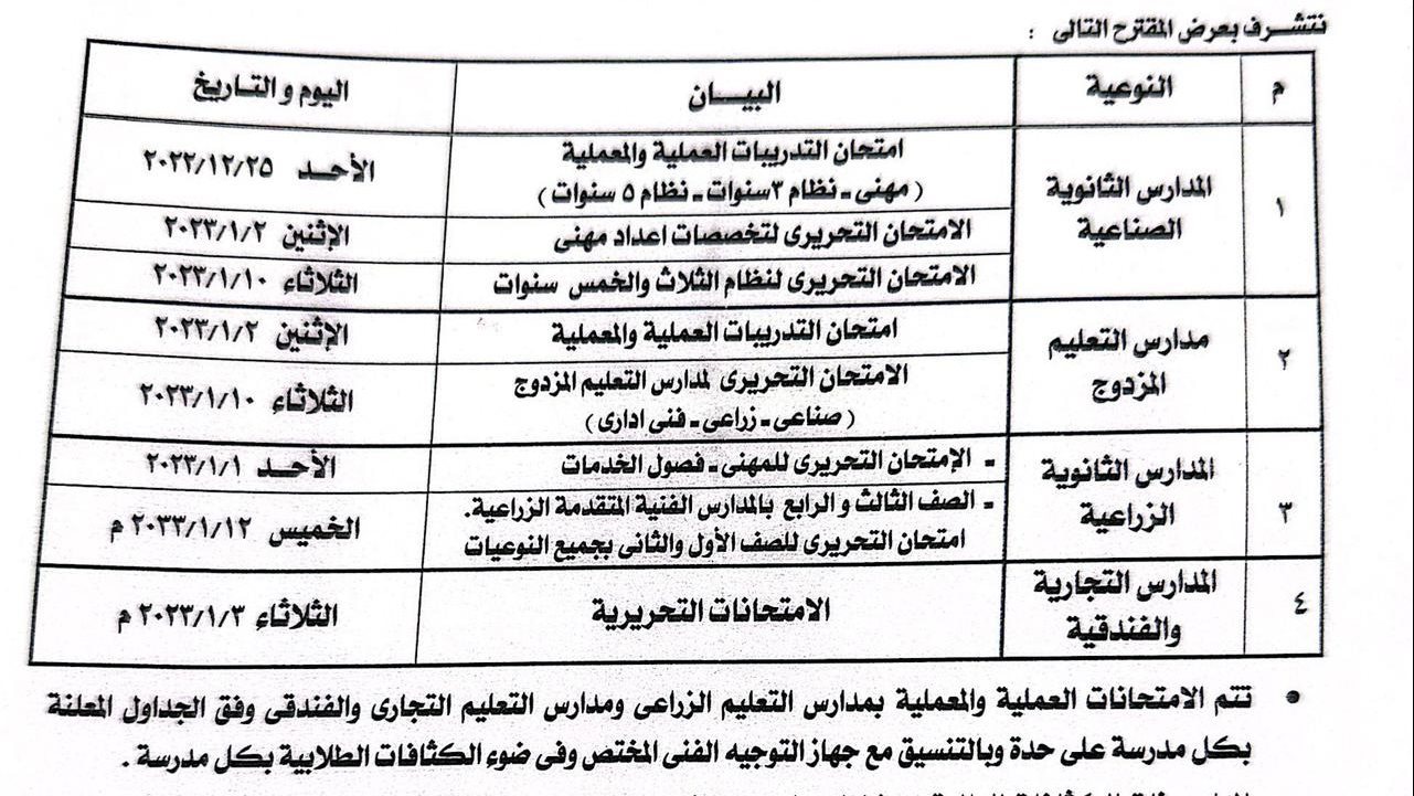 واخيرا المدارس التجارية والفنية الامتحانات التحريرية الثلاثاء 3 يناير.