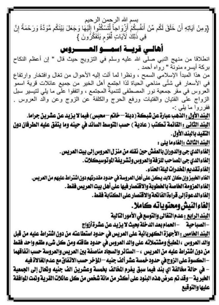 وأوضح «إمام المسجد» خلال حديثه لـ “فيتو”، قائلًا: إن من ضمن البنود، إلغاء الدي جي والدوران بالدراجات البخارية حين نقل العفش من منزل العريس إلى منزل العروسة، بالإضافة إلى إلغاء الخبز وإن كان لا بد يكن من أهل العروس في حدود مقدرتهم دون اشتراط عليهم من العريس، وتقرر تجهيز 10 أزواج حمام بدلًا من 70 جوز حمام كان يتم تقديمه في صباحية الجواز.