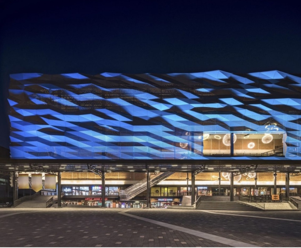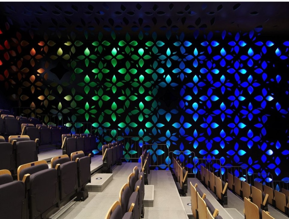 تصبح المادة الفريدة للواجهة غير مادية أثناء الليل مما يعطي تأثيرًا سرياليًا بسبب الإضاءة الاصطناعية المدمجة فيه.