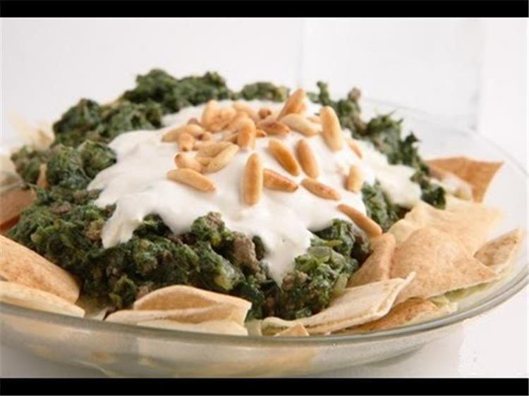 * في طبق التقديم ضعي العيش المقلي، ثم ضيفي طبقة من السبانخ باللحمة، ثم ضيفي صوص الزبادي.