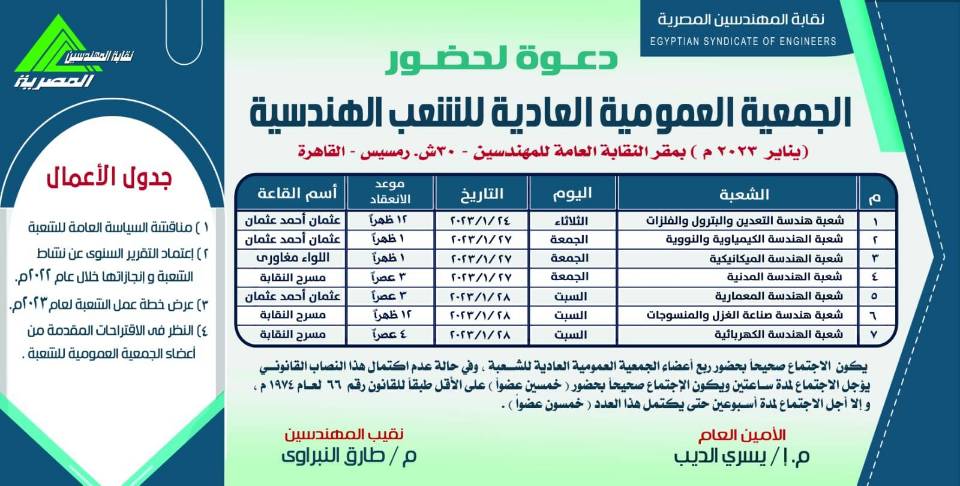 دعت نقابة المهندسين، أعضاءها لحضور الجمعية العمومية العادية للشُعب الهندسية، وذلك في شهر يناير عام 2023 بمقر النقابة العامة.
