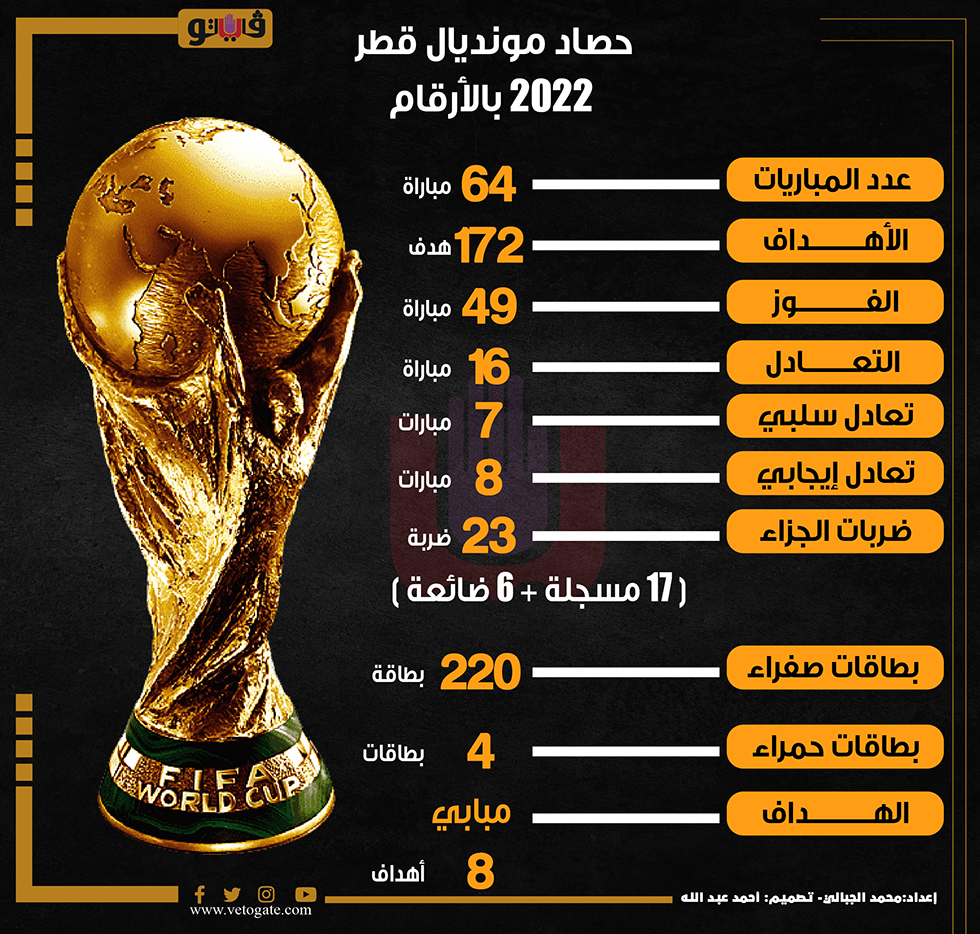 حصاد مونديال قطر 2022 بالأرقام ( انفوجراف ) الأحد 18/ديسمبر/2022 - 08:31 م 12/18/2022 8:31:00 PM منتخب الأرجنتين، فيتو شارك طباعة 18 حجم الخط شارك طباعة بطاقات صفراء مونديال قطر 2022 قطر 2022 ضربات الجزاء مونديال قطر بالأرقام
