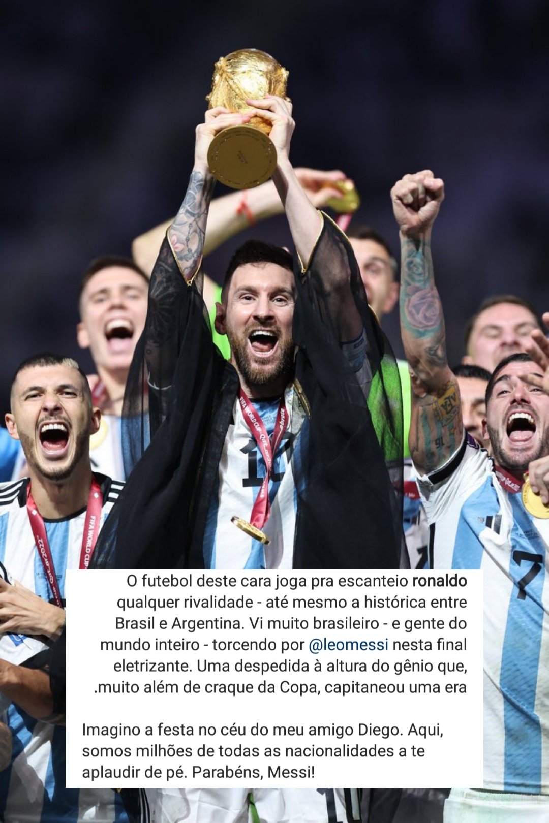 ونشر الظاهرة عبر صفحته الرسمية على موقع التواصل الإجتماعي انستجرام صورة لميسي وكتب: هذا الرجل جعل حتى المنافسة التاريخية بين البرازيل والارجنتين تخف كثيرًا وجعلنا نشاهد بعض البرازيليين وأشخاص من كل العالم يشجعون ليو ميسي.