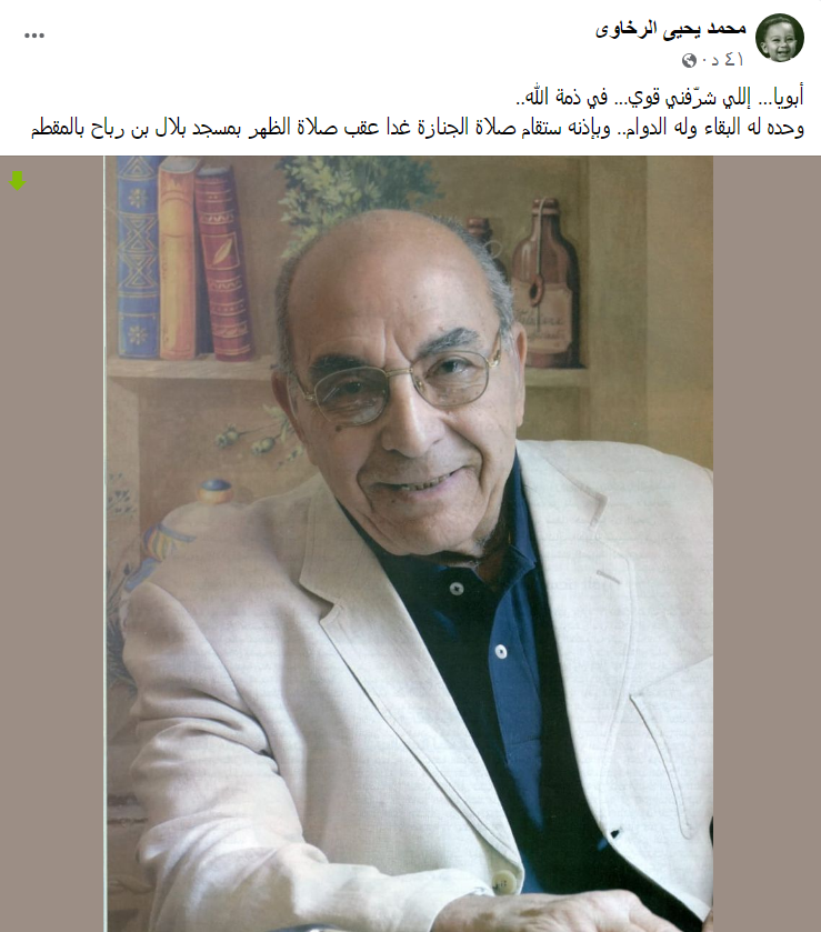 ونعى الدكتور محمد يحيى الرخاوي، والده الدكتور يحيى الرخاوي، وكتب على صفحته بموقع التواصل الإجتماعي "فيس بوك"، منشور قال فيه: "أبويا.. اللي شرفني قوي.. في ذمة الله.. وحده له البقاء وله الدوام.. وبإذنه ستقام صلاة الجنازة اليوم عقب صلاة الظهر بمسجد بلال بن رباح بالمقطم".