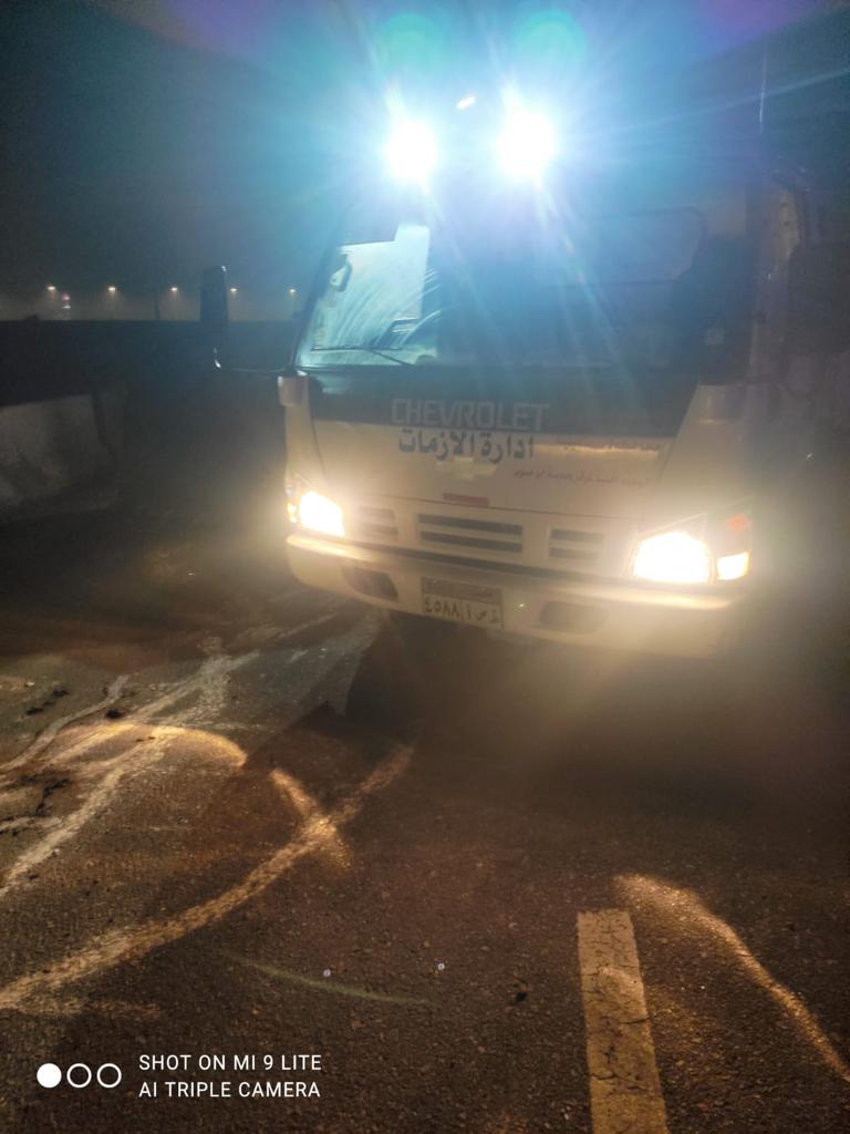 ومن جهة أخرى تواصل الأجهزة التنفيذية بالتعاون مع الأجهزة الأمنية في محافظة الإسماعيلية، قيامها برفع آثار حادث انقلاب سيارة نقل ثقيل، انقلبت نتيجة اختلال عجلة القيادة بطريق الإسماعيلية السويس وتحديدا بمنطقة محور يونيو نزلة السويس.