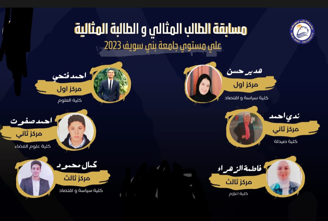 أعلن الدكتور منصور حسن رئيس جامعة بني سويف، نتيجة مسابقة الطالب المثالي والطالبة المثالية، للعام الدراسي 2022 / 2023م، والتي نظمتها إدارة رعاية الشباب بالجامعة، تحت إشراف الدكتور جمال عبد الرحمن نائب رئيس الجامعة لشئون التعليم والطلاب، ومحمد فاروق مدير عام رعاية الشباب.