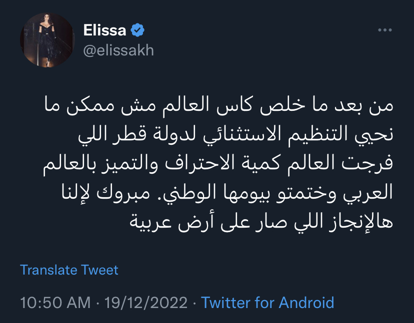 وكتبت إليسا قائلة: "من بعد ما خلص كاس العالم مش ممكن ما نحيي التنظيم الاستثنائي لدولة قطر اللي فرجت العالم كمية الاحتراف والتميز بالعالم العربي وختمته بيومها الوطني.. مبروك لينا الإنجاز اللي صار على أرض عربية".