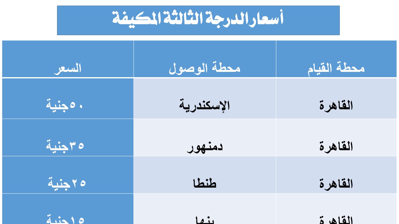 أسعار القطار المكيف الدرجة الثالثة من القاهرة إلى الاسكندرية 50جنيها