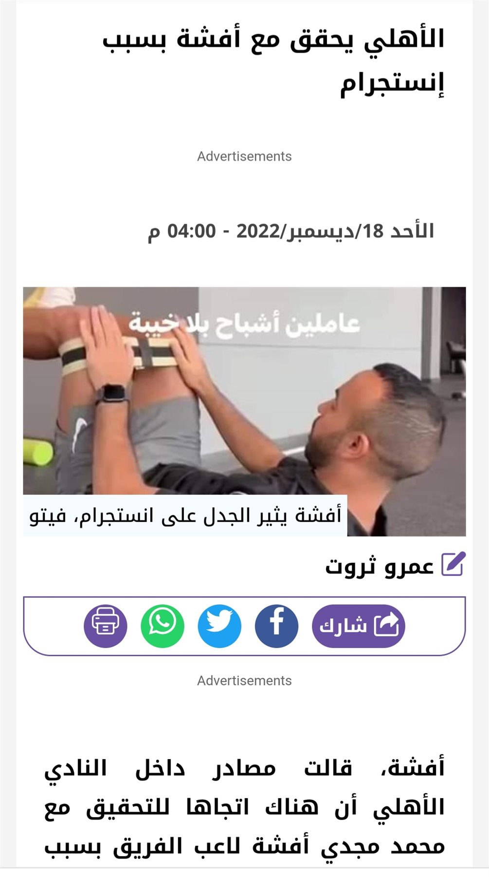 وقالت المصادر: حذف أفشة للصور من انستجرام أمس لم يكن كافيا لعدم تغريمه وإعلان ذلك رسميا اليوم.