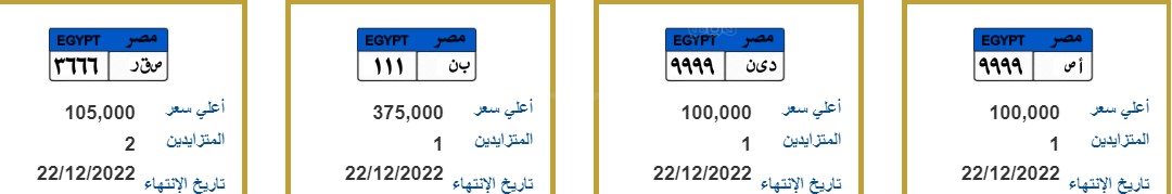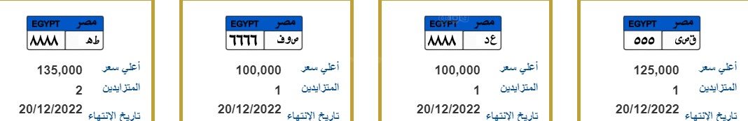 وكما شملت افضل اللوحات المطروحة:" أ ص 9999" بـ 100 ألف، " د ى ن 9999" بـ 100 جنيه، " ب ن 111" بـ 375 ألف جنيه، " ص ق ر 3666" بقيمة 105 آلاف جنيه، " ب ل 1111" بـ 180 ألف جنيه، " أ أ أ 5111" بقيمة 105 آلاف جنيه.