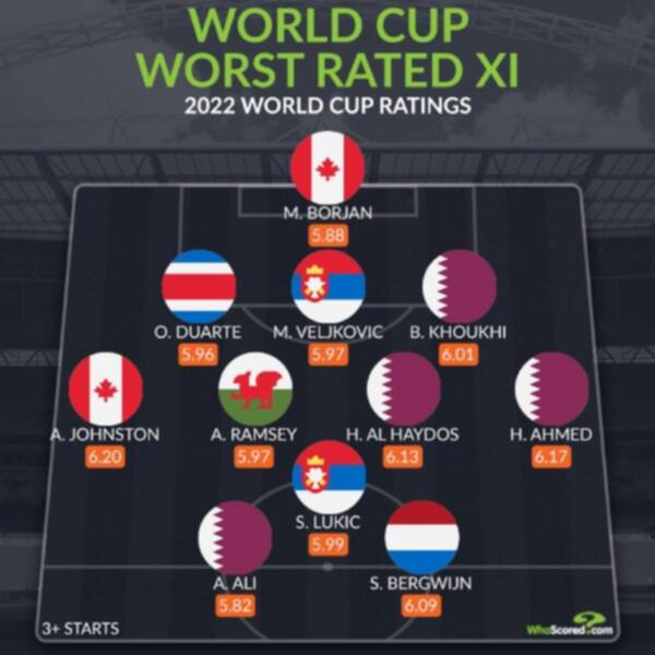 وجاءت تشكيلة الأسوأ في كأس العالم 2022، وفق "هو سكورد"، كما يلي: