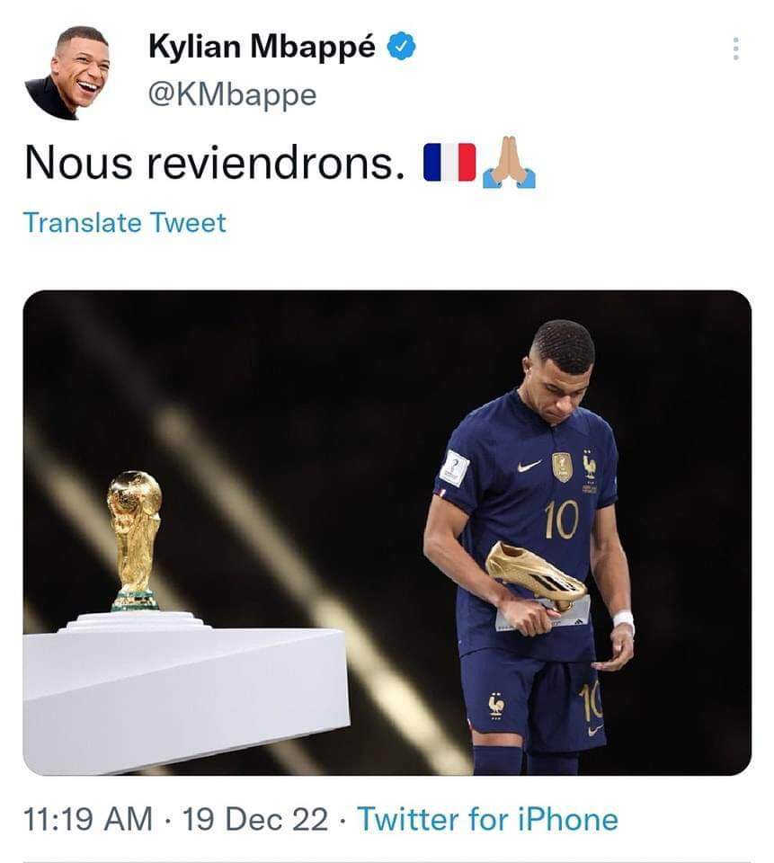 ونشر مبابي، على حسابه بشبكة "تويتر"، صورة تجمعه بكأس العالم، وأثناء حمل جائزة هداف المونديال، وكتب عليها: "سنعود".