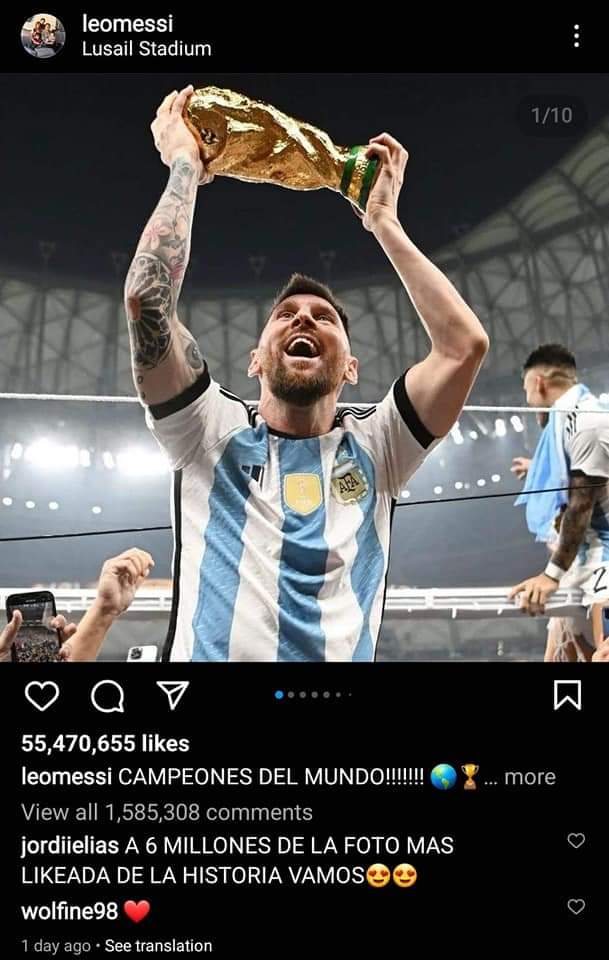 وبلغ منشور ليونيل ميسي احتفالًا بالفوز بلقب كأس العالم 55.5 مليون إعجاب على موقع إنستجرام وبذلك يصبح أعلى منشور رياضي في التاريخ يحصل على إعجابات.