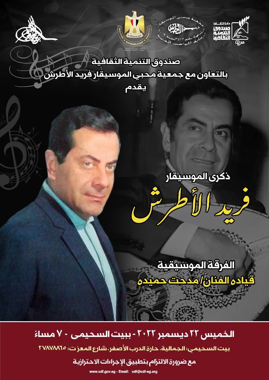 يحيي مركز إبداع بيت السحيمي بشارع المعز والتابع لقطاع صندوق التنمية الثقافية ذكرى وفاة فريد الأطرش، بالتعاون مع جمعية محبي الموسيقار فريد الأطرش، وذلك في تمام السابعة مساء الخميس 22 ديسمبر الجاري.