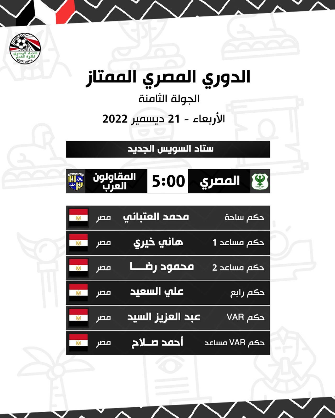 الدوري الممتاز، محمد العتباني حكما للقاء المصري والمقاولون