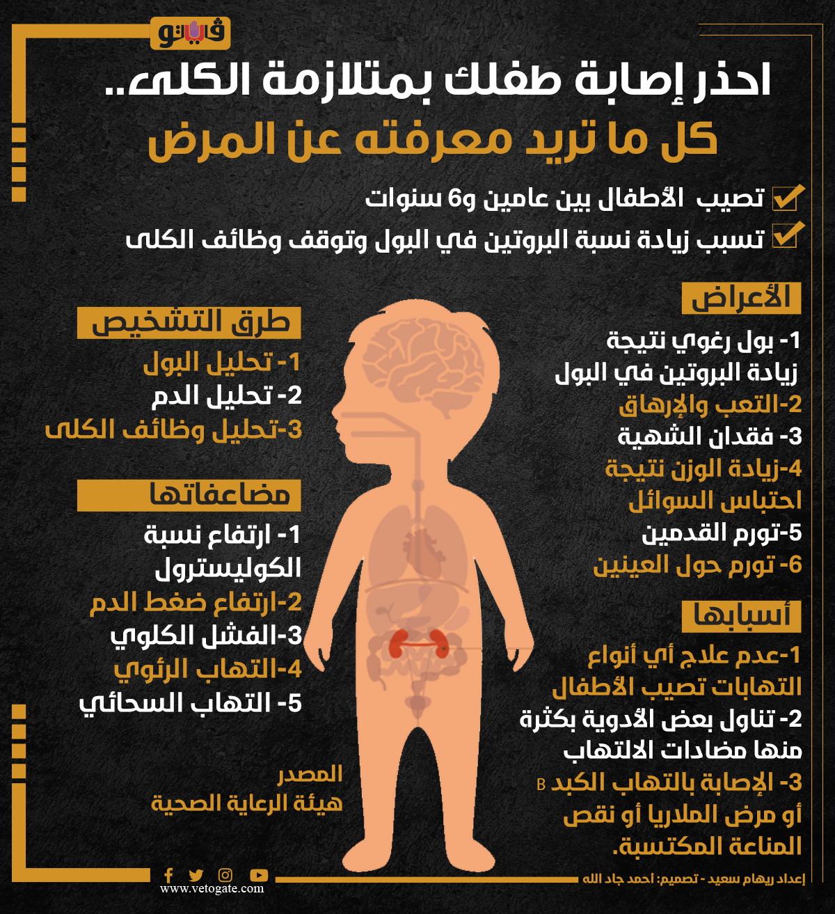 احذر إصابة طفلك بمتلازمة الكلى.. كل ما تريد معرفته عن المرض (انفوجراف) الخميس 22/ديسمبر/2022 - 08:17 م 12/22/2022 8:17:20 PM متلازمة الكلي ريهام سعيد شارك طباعة 18 حجم الخط شارك طباعة التهاب الكبد B ارتفاع نسبة الكوليسترول ارتفاع ضغط الدم هيئة الرعاية الصحية تورم القدمين نقص المناعة المكتسبة