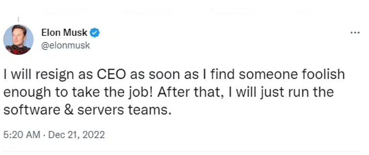 وقال المؤسس المساعد لـ شركة تيسلا: "سأستقيل من منصبي كمدير تنفيذي لتويتر، عندما أجد شخصا غبيا بما فيه الكفاية ليأخذ هذه الوظيفة.. بعد ذلك سأدير البرمجيات والسيرفرات".