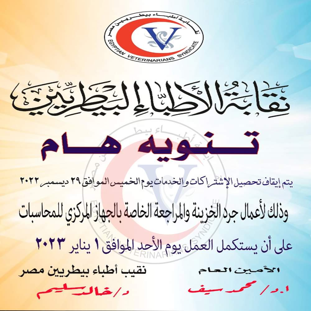 أعلنت نقابة البيطريين، برئاسة الدكتور خالد سليم نقيب عام الأطباء البيطريين، إيقاف تحصيل الاشتراكات والخدمات الخاصة بالأعضاء وذلك يوم الخميس 29 ديسمبر 2022؛ لأعمال جرد الخزينة والمراجعة الخاصة بالجهاز المركزي على أن يستكمل تقديم الخدمات اعتبارا من الأول من يناير القادم.