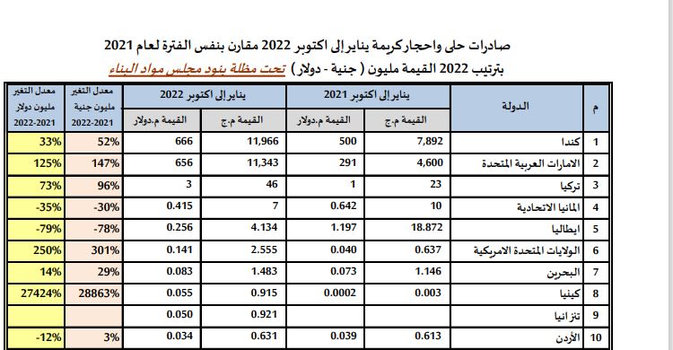 ورصد التقرير الشهري الصادر عن المجلس التصديري لمواد البناء والحراريات والصناعات المعدنية الذي حصلت فـيتـو على نسخة منه، أهم الدول المستوردة للذهب والحلى والأحجار الكريمة خلال أول 10 شهور من العام الحالى كالتالي: