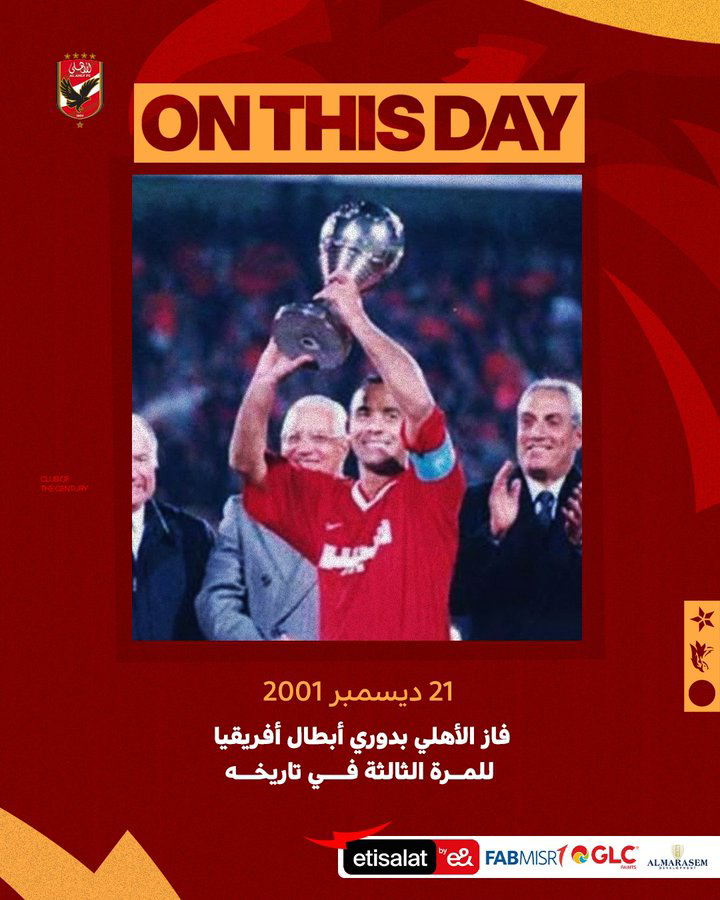 ونشر الحساب الرسمي للنادي الأهلي عبر فيس بوك صورة من تتويج الأهلى بدورى أبطال أفريقيا عام 2001 وعلق عليها قائلا" الأهلي يفوز ببطولة أفريقيا للأندية أبطال الدوري للمرة الثالثة في تاريخه على حساب صن داونز الجنوب أفريقي بنتيجة 3-0.