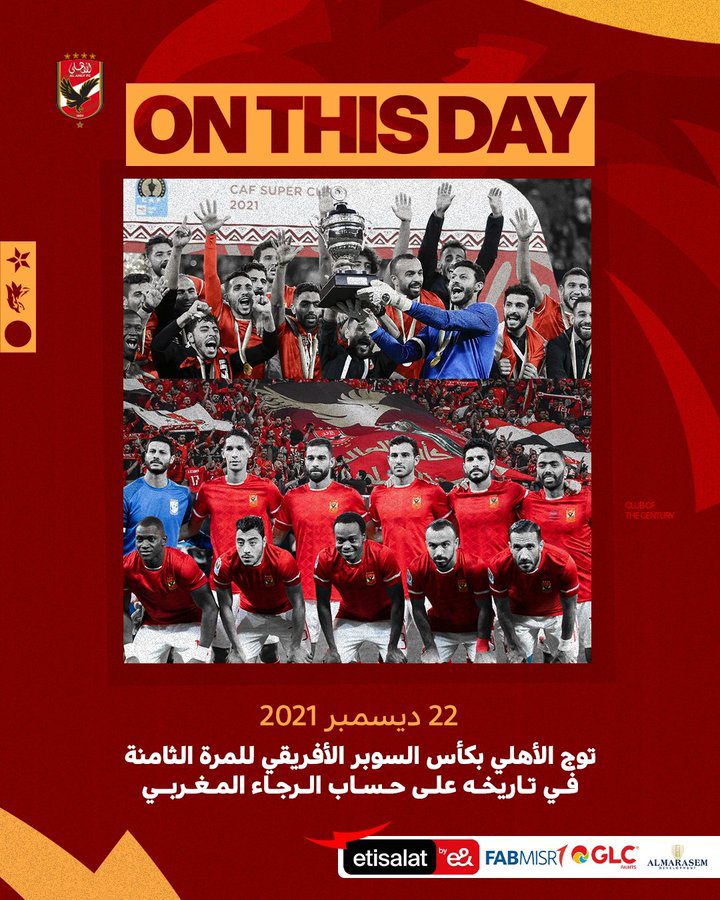 السوبر الأفريقي، حرص الحساب الرسمي للنادي الأهلي عبر موقع التواصل الاجتماعي فيس بوك على الاحتفال بذكرى حصول الفريق الأول لكرة القدم بالنادي على لقب كأس السوبر الأفريقي للمرة الثامنة في تاريخ القلعة الحمراء الذي كان في مثل هذا اليوم الثاني والعشرين من ديسمبر من العام الماضي 2021 عقب تغلبه على فريق الرجاء البيضاوي المغربي بركلات الترجيح بنتيجة 6-5 وذلك عقب انتهاء الوقت الأصلي للقاء بالتعادل الإيجابي بنتيجة 1-1.