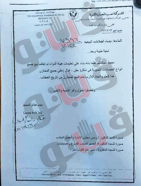 أصدرت الشركة المصرية لتجارة الأدوية إحدى الشركات التابعة لهيئة الشراء الموحد منشورا لجميع الفروع بناء علي تعليمات هيئة الدواء المصرية بالتوقف عن بيع المضادات الحيوية في شكل حقن ومنع التوزيع علي جميع المخازن.