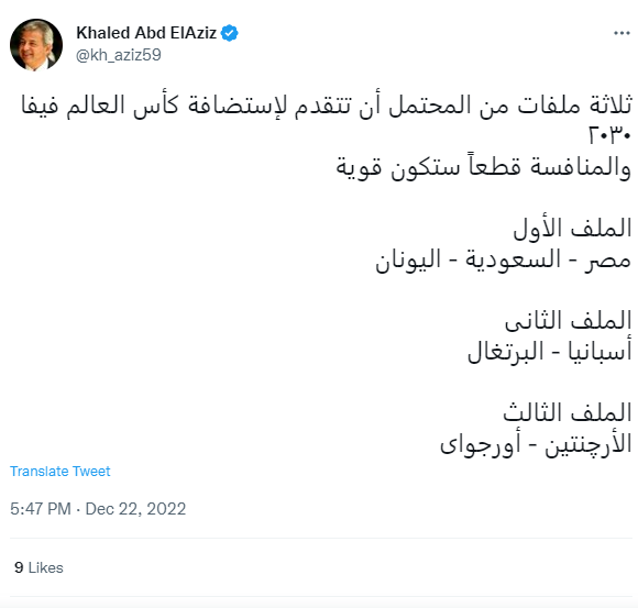 وكتب عبد العزيز عبر حسابه الشخصي بموقع التواصل الاجتماعي “تويتر” تغريدة تتضمن:" ثلاثة ملفات من المحتمل أن تتقدم لإستضافة كأس العالم فيفا ٢٠٣٠".
