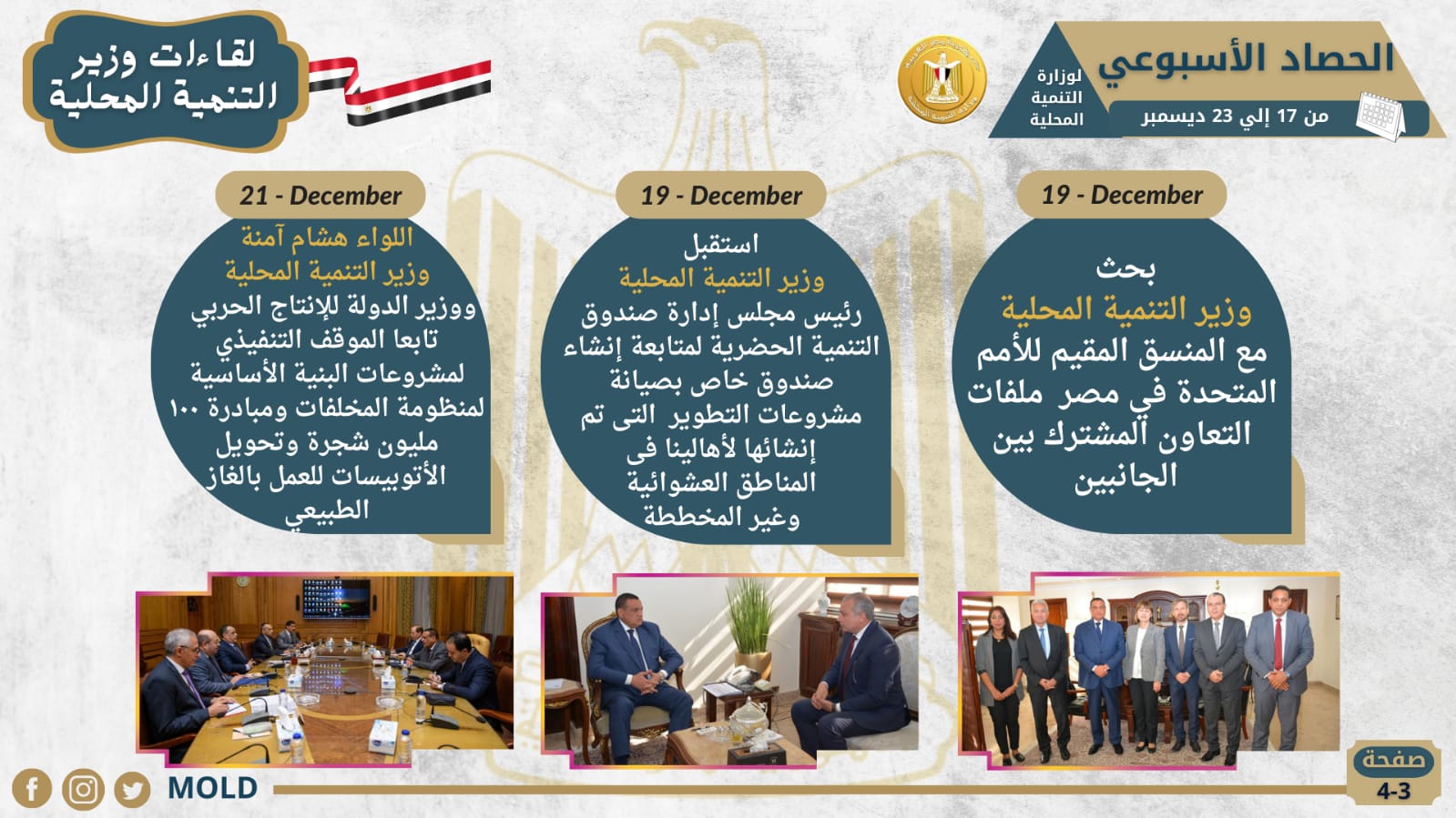 أصدر المركز الإعلامي، التابع لوزارة التنمية المحلية، " الانفوجراف الأسبوعي" في نسخته الرابعة عشر حول حصاد أهم الأنشطة والفعاليات التي قام بها اللواء هشام آمنة وزير التنمية المحلية، خلال الأسبوع الماضي في الفترة من 17 إلي 23 ديسمبر الجاري، حيث نستعرض أبرزها في التقرير التالي الذي نشرته الصفحة الرسمية لوزارة التنمية المحلية علي موقع التواصل الاجتماعي" فيس بوك" من خلال انفوجراف يرصد أبرز تلك الأنشطة التي جاءت كالتالي: