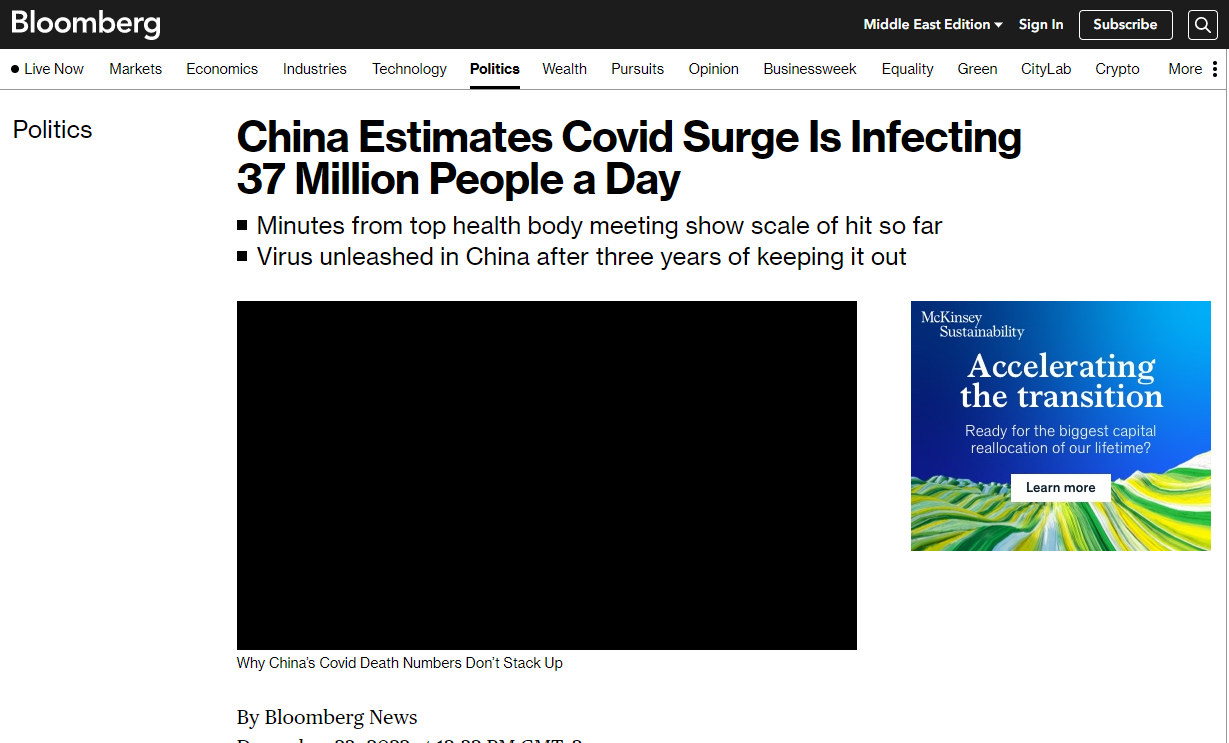ذكرت أكبر هيئة صحية حكومية في الصين أنه ربما قد أصيب ما يقرب من 37 مليون شخص بالبلاد بكوفيد-19 في يوم واحد هذا الأسبوع، ما يجعل تفشي الفيروس بالبلاد، هو الأكبر في العالم إلى حد بعيد.