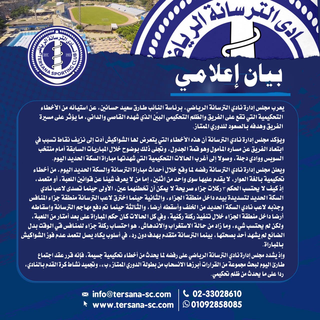 وكان نادي الترسانة أصدر بيان رسمي بعد أحداث مباراة السكة الحديد في دوري القسم الثاني والتي أقيمت على ملعب الشواكيش في ميت عقبة.
