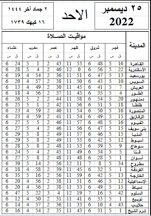 مواقيت الصلاة اليوم الأحد 25- 12-2022 في القاهرة والمحافظات