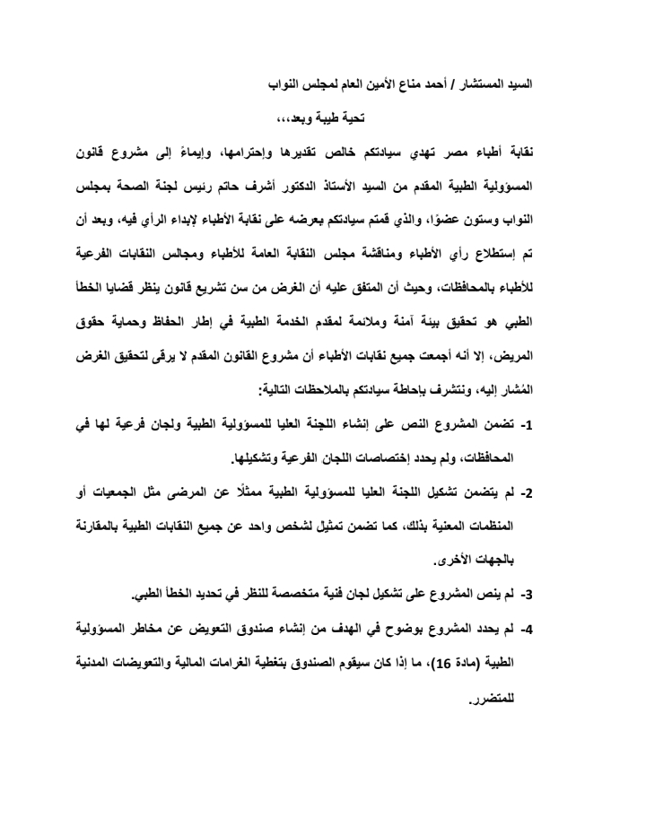وتناول خطاب الرد الذي أرسله الدكتور حسين خيري نقيب الأطباء، إلى المستشار أحمد مناع أمين عام مجلس النواب، شرحًا تفصيليًا لملاحظات الأطباء على مشروع القانون المقدم وكذلك طلبات وتطلعات الأطباء في قانون يحقق الاستقرار ويحمي مزاول المهن الطبية إقترانًا بالحفاظ على حقوق المريض.