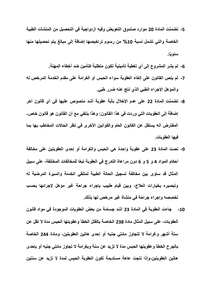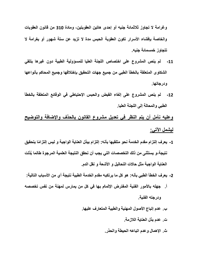 ١- التأكيد على عدم جواز عقوبة الحبس في الخطأ الطبي إلا لمزاول المهن الطبية بدون ترخيص أو خارج التخصص بصفة متعمدة في غير حالات الطوارئ.